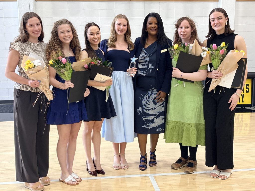 Top photo (l to r): Lydia A., Emma M., Victoria Z., Maddie D. (student recipient), Dr. Siabhan May-Washington, Elizabeth B., Drew K.